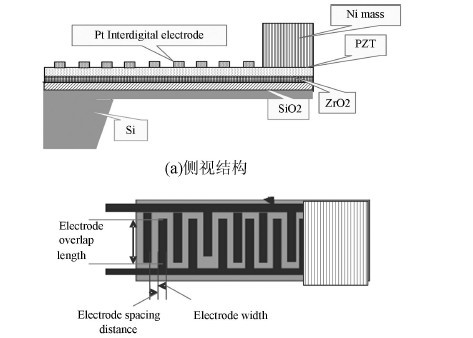 壓電效應有兩種: d31 和d33 模式[8 ] 。本文介紹了一種采用d33 模式制作的復合懸臂梁式結構,如圖2 。它由Pt/ Ti 叉指電極, PZT 壓電層, ZrO2 , SiO2和Si 層組成,在梁的自由端加一鎳質量塊,如圖1 。其中叉指電極可以產(chǎn)生d33 模式的響應電場; ZrO2層作為絕緣層可以阻擋PZT 層產(chǎn)生的電荷泄漏。