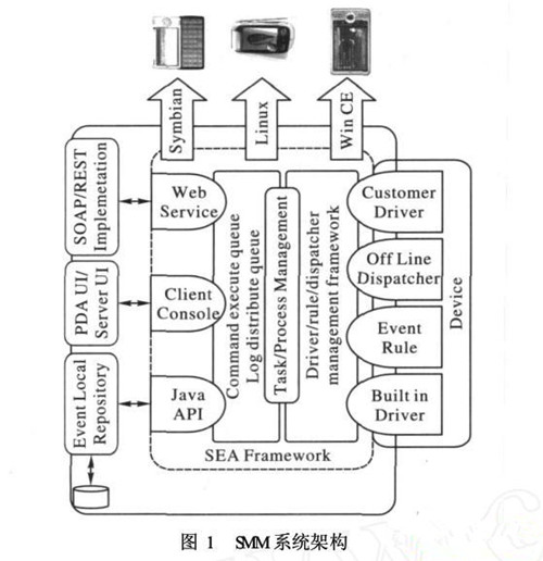 SMM的系統(tǒng)整體架構(gòu)包括三大模塊,其中:最下層為Device模塊,負(fù)責(zé)把物理的真實(shí)設(shè)備抽象為系統(tǒng)的Device對(duì)象;中間層為Task Manager模塊,是SMM的核心模塊,負(fù)責(zé)處理用戶和上層應(yīng)用系統(tǒng)的一切命令,把標(biāo)準(zhǔn)的XML命令轉(zhuǎn)化系統(tǒng)的Task對(duì)象并執(zhí)行,以用來(lái)控制Device對(duì)象;最上層是用戶接口(User Interface,UI)模塊,是基于標(biāo)準(zhǔn)的Java swing開發(fā)的圖形界面,使用戶可以在本地方便地控制Device對(duì)象。同時(shí),SMM也提供標(biāo)準(zhǔn)Web service接口,方便其他遠(yuǎn)程系統(tǒng)控制和管理移動(dòng)設(shè)備。