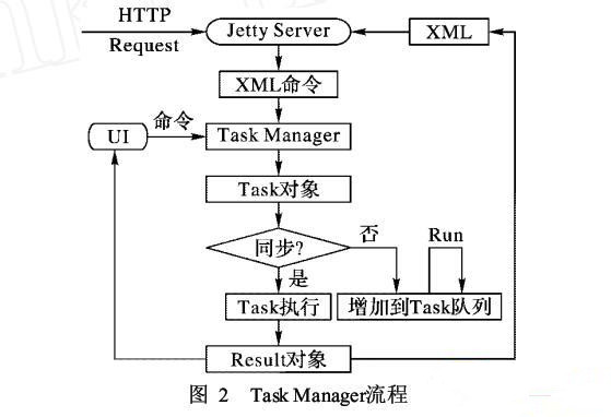 基于Task Manager模塊,SMM提供圖形界面和Web Service兩種類型的請(qǐng)求來(lái)控制和管理移動(dòng)設(shè)備,以使用戶獲取所需的數(shù)據(jù)。如果是SMM內(nèi)部請(qǐng)求,則提供標(biāo)準(zhǔn)的Java API;如果是外部請(qǐng)求,則提供基于XML的標(biāo)準(zhǔn)Web接口。圖3給出了Task Manager的實(shí)現(xiàn)流程。在模塊中,上層應(yīng)用程序通過(guò)HTTP協(xié)議把標(biāo)準(zhǔn)XML命令發(fā)送到SMM,SMM通過(guò)內(nèi)嵌的輕型HTTP Server Jetty處理各種HTTP請(qǐng)求。Jetty接受到標(biāo)準(zhǔn)的XML請(qǐng)求后,把各種XML命令給Task Manager模塊,Task Manager解析XML格式的命令后,通過(guò)Java反射得到對(duì)應(yīng)的Task對(duì)象。如果Task對(duì)象是同步的,則調(diào)用Task執(zhí)行方法,返回相應(yīng)結(jié)果并轉(zhuǎn)化成標(biāo)準(zhǔn)XML給Jetty服務(wù)器;如果Task對(duì)象是異步的,則放到任務(wù)隊(duì)列里面去,返回為空。