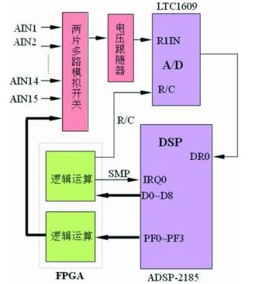 硬件系統(tǒng)的示意圖如圖1所示。外部輸入的電壓電流經(jīng)過電壓互感器或電流互感器,經(jīng)過信號調(diào)理,變換成小電壓信號,把這些小電壓信號經(jīng)過濾波、放大處理之后送入模擬多路開關(guān)。接入多路開關(guān)的信號AIN1、AIN2、…AIN15的切換由DSP通過FPGA來控制。多路開關(guān)的輸出接電壓跟隨器,以降低信號源的輸出阻抗,保證得到較高的采集精度。經(jīng)A/D轉(zhuǎn)換完成后的數(shù)據(jù)由DSP芯片進行采集處理。