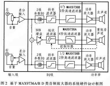 該系統(tǒng)硬件電路設(shè)計(jì)有左,右聲道和重低音聲道兩部分。每部分包括輸入級、EQ級和功率級,如圖2所示。