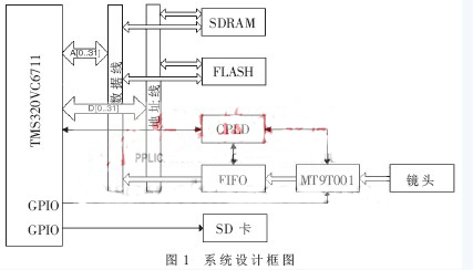 由于大部分DSP都有與SDRAM、Flash、SRAM、FIFO等存儲(chǔ)器接口的EMIF接口,而沒(méi)有直接與CMOS/CCD固體圖像傳感器接口的控制器。所以采用CPLD作為圖像傳感器到FIFO以及FIFO到DSP的一個(gè)時(shí)序協(xié)調(diào)控制器。同時(shí)由于圖像傳感器的像素時(shí)鐘PIXCLK很高,最高可以達(dá)到 48MHz,固體圖像傳感器的圖像數(shù)據(jù)量大,而FIFO的容量有限,一般都是幾K、幾十K字節(jié),對(duì)于高像素的圖像來(lái)說(shuō),F(xiàn)IFO只能充當(dāng)線緩沖的作用,要作為幀緩沖,除非系統(tǒng)對(duì)速度要求很高,否則成本太高。由于采集到DSP中的圖像數(shù)據(jù)量很大,靠寫文件的方式來(lái)驗(yàn)證采集的數(shù)據(jù)非常慢,所以本系統(tǒng)采用 GPIO設(shè)計(jì)了一個(gè)SD卡的控制器,通過(guò)寫B(tài)MP文件,對(duì)采集的圖像進(jìn)行驗(yàn)證。系統(tǒng)設(shè)計(jì)框圖如圖1所示。