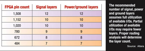圖為可用I/O被完全利用時(shí)推薦的信號(hào)、電源和接地層數(shù)目。