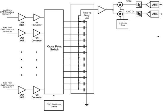 典型的相控陣CWD(連續(xù)波多普勒)架構(gòu)中,超聲傳感器的聚焦孔徑分成兩部分,一半的(64至128個(gè))傳感器單元用于發(fā)送器,另一半用于接收器。作用在發(fā)射單元的信號(hào)是方波信號(hào),典型頻率為2.0 MHz至7.5 MHz多普勒頻率。發(fā)射單元通過發(fā)送適當(dāng)相位的信號(hào)聚焦發(fā)射波束。同樣,CWD接收信號(hào)通過對(duì)每個(gè)接收單元的信號(hào)進(jìn)行相位調(diào)整、求和進(jìn)行聚焦。