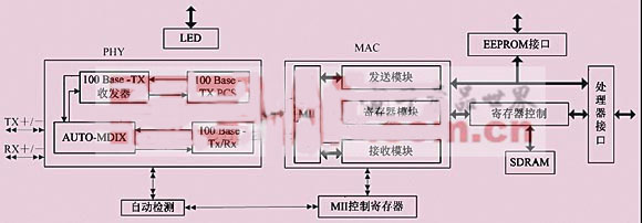 DM9000AE是DEVICOM(臺(tái)灣聯(lián)杰國(guó)際)研發(fā)的一款10/100M快速以太網(wǎng)控制芯片。DM9000AE實(shí)現(xiàn)以太網(wǎng)媒體介質(zhì)訪問(wèn)層(MAC)和物理層( PHY)的功能,包括MAC數(shù)據(jù)幀的組裝/拆分與收發(fā)、地址識(shí)別、CRC編碼/校驗(yàn)、MLT-3編碼器、接收噪聲抑制、輸出脈沖成形、超時(shí)重傳、鏈路完整性測(cè)試、信號(hào)極性檢測(cè)與糾正等。DM9000AE內(nèi)部邏輯結(jié)構(gòu)如圖1所示。