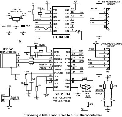 在PIC引腳2和3之間接入一個(gè)20MHz晶振可在其UART接口獲得高達(dá)115200bit/s波特率,而使用內(nèi)部8MHz振蕩器只能獲得最高9600bit/s波特率,因此加接晶振可提高系統(tǒng)性能。PIC的IO引腳RC2和RC3都被固件使用,以模擬與VNC1LUART連接的RTS/CTS握手信號(hào)。系統(tǒng)由PIC上的固件控制,數(shù)據(jù)傳輸則由PIC發(fā)出的指令控制,該指令由Vinculum上的標(biāo)準(zhǔn)固件進(jìn)行解釋。雖然說起來很簡(jiǎn)單,但完成設(shè)計(jì)還有其他一些工作要做,例如器件還需要電源、控制時(shí)鐘的晶振以及編程。