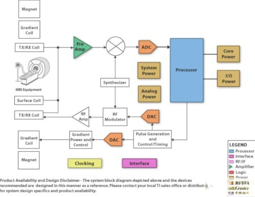 全身 MRI 系統(tǒng)可能有一個多達(dá)76個元件或通道的線圈矩陣。另外,低壓(LV)模擬輸入沿長同軸線纜從肢體線圈傳輸至模擬信號鏈前置放大器。當(dāng)談到MRI接收信號鏈時,兩個關(guān)鍵隨之出現(xiàn):如何獲得高信噪比(SNR)(至少約84dB或14位);如何實(shí)現(xiàn)總系統(tǒng)的極高總動態(tài)范圍(至少150dB/Hz左右)。獲得高SNR要求一個超低噪聲系數(shù)的高性能前置放大器。使用如動態(tài)增益調(diào)節(jié)或模擬輸入壓縮等創(chuàng)新方案可以達(dá)到高動態(tài)范圍要求。