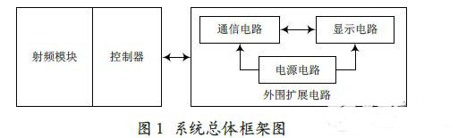 該系統(tǒng)總體上分為兩個(gè)部分:第一部分是控制器與射頻模塊部分;第二部分是外圍擴(kuò)展電路部分。具體的系統(tǒng)框架圖如圖1 所示。