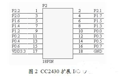 CC2430 具有21 個(gè)數(shù)字I/O 口引腳,即P0、P1、P2.它們均是8 位I/O 口。每個(gè)口都可以單獨(dú)設(shè)置為通用I/O 或外部設(shè)備I/O.除了兩個(gè)高輸出口P1_0 和P1_1 之外,其余均用于輸出。本設(shè)計(jì)相關(guān)I/O 口通過(guò)插接件形式進(jìn)行預(yù)留,以方便不同場(chǎng)合使用及擴(kuò)展,具體如圖2 所示。