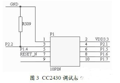本設(shè)計(jì)CC2430 具備在線調(diào)試與下載功能,可根據(jù)需要進(jìn)行自由配置。圖3 所示是CC2430 調(diào)試接口圖,該接口通過(guò)調(diào)試接口引腳P2.2 與P2.1 組成,它們分別用作調(diào)試時(shí)鐘與調(diào)試數(shù)據(jù)信號(hào)引腳。
