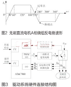 目前無位置傳感器無刷直流電機(jī)驅(qū)動策略主要以反電勢法為主,也就是說不需要借助位置傳感器,僅通過檢測反電勢信號就可以判斷轉(zhuǎn)子位置,具有結(jié)構(gòu)簡單、可靠性高等優(yōu)點(如下圖所示),為A相繞組的反電勢在一個電周期內(nèi)的波形,其中橫軸代表當(dāng)前運行時刻的電角度,縱軸代表A相繞組產(chǎn)生的反電勢Ea。從圖中可以看出,當(dāng)檢測到反電勢信號過零點后,再延遲30°電角度即是換相點。對于三相繞組電機(jī),每隔60°電角度就會產(chǎn)生一個反電勢過零點,過零點信號被ADuC7060微控制器檢測并處理后,就可以產(chǎn)生相應(yīng)的驅(qū)動信號驅(qū)動電機(jī)連續(xù)運轉(zhuǎn)。