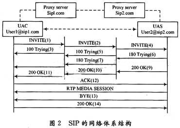 圖2中,User@sipl.com作為UAC,希望同User2@sip2.com通話,UAC首先發(fā)送一個INVITE請求,本地的SIP代理服務(wù)器sipl.com接收到這個INVITE請求后,經(jīng)過地址解析,將其發(fā)送至SIP代理服務(wù)器sip2.corn,同時sip1.com返回給User1一個100 Trying消息。sip2.com接收到sip1.com的INVITE請求后,將其轉(zhuǎn)發(fā)給user2@sip2.com,并返回給sip1.com一個Trying消息。User2接收到INVITE請求后,在應(yīng)答之前,將返回給sip2.com一個180 Ringing消息,此Ringing消息將依次轉(zhuǎn)發(fā)給sip1.com,User1。如果User2決定應(yīng)答呼叫,則返回一個200 OK消息,此消息經(jīng)過sip2.com,sip1.com,最后到達(dá)User1。User1在收到200 OK消息后,直接發(fā)送一個ACK確認(rèn)消息給User2。至此呼叫建立過程完成,User1和User2之間可以建立媒體通道進(jìn)行對話。當(dāng)一方想結(jié)束通話時,發(fā)送一個BYE消息給對方,對方返回一個200 OK消息,SIP呼叫即被終止。