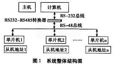 系統(tǒng)中計算機PC作為主機,AVR單片機作為從機,采用RS-485工業(yè)現(xiàn)場總線通信。由于計算機的串口采用RS232總線標(biāo)準(zhǔn),因此在主機的串行通信端口必須增加RS485-RS232電平轉(zhuǎn)換器,在計算機串行端口由該電平轉(zhuǎn)換器實現(xiàn)RS-232電平與RS-485電平轉(zhuǎn)換,主機與從機通過MOD-BUS通信協(xié)議在RS-485總線上進(jìn)行數(shù)據(jù)通信和交換,在整個RS-485總線上最多可以接255臺從機。系統(tǒng)的總體結(jié)構(gòu)如圖1所示。