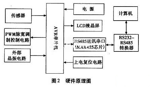 整個硬件電路包括:PC機、RS485-RS232電平轉(zhuǎn)換器、電源、復(fù)位電路、晶振電路、AVR單片機控制系統(tǒng)。本系統(tǒng)上位機由PC機和串口組成,下位機由兩個單片機控制系統(tǒng)組成。兩個從機設(shè)備地址為01和02,每個單片機系統(tǒng)由Atmega32單片機,TSl2864A-3型LCD液晶顯示器,傳感器,PWM脈寬調(diào)制控制電路組成。下位機基于Atmega32單片機,通過傳感器對采集數(shù)據(jù)再經(jīng)過A/D轉(zhuǎn)換后在LCD液晶屏顯示,Atmega32單片機帶有MAX485串口,通過RS-485總線與上位機通訊,系統(tǒng)的總體硬件原理圖如圖2所示。