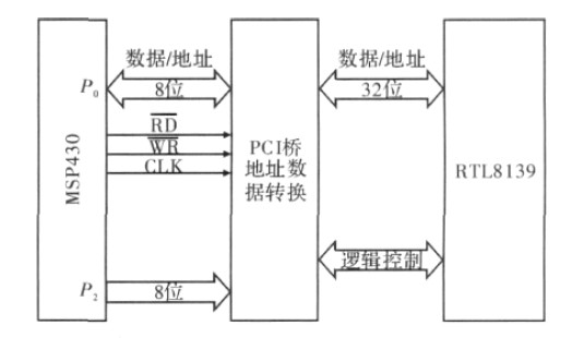 由于RTL8139 是PCI 總線接口,不能直接與8 位的MCU 接口,需要一個PCI 接口進行轉接。單片機在進行外部存儲器操作時采用的信號有P0口、P2口、ALE以及RD 和WR 信號。其中,P0口為地址( 低8 位) /數(shù)據(jù)復用,P2口為高8 位地址信號; ALE 為地址鎖存信號,為高電平時將P0口的值鎖存到低8 位數(shù)據(jù)線上; RD 和WR 為讀寫有效信號,低電平有效。因此,PCI 接口實際上是起到一個從單片機讀寫時序到32位PCI 讀寫時序轉換的作用。