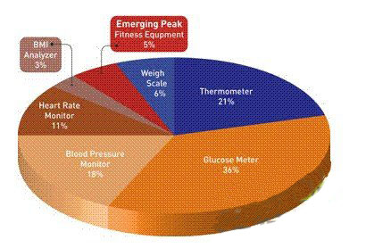 圖1:2009年全球消費醫(yī)療出貨量,從中可以了解各類消費醫(yī)療出貨量在半導(dǎo)體產(chǎn)品收入中所占的百分比。
