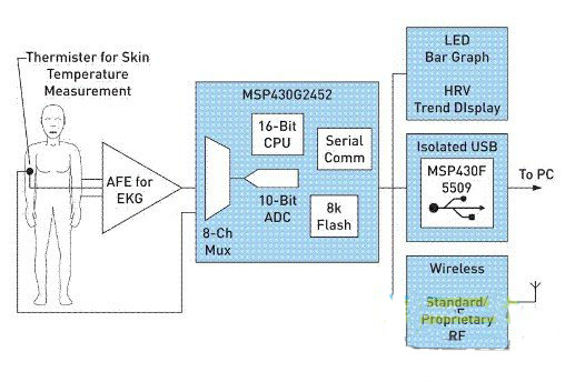 圖3為HRV系統(tǒng)方框圖。在這種配置方案中,一個AFE將EKG信號放大1000倍。由MCU實施數(shù)字轉(zhuǎn)換和進(jìn)一步的處理。HRV的計算方法是:首先計算心率,并利用MCU存儲器中的記錄心率信息推算出其隨時間的走勢。在其最簡單的獨立型實現(xiàn)方案中,HRV利用LED柱狀圖來顯示。在更加高級的裝置中,HRV可通過USB或無線連接發(fā)送至PC或智能手機(jī)設(shè)備。