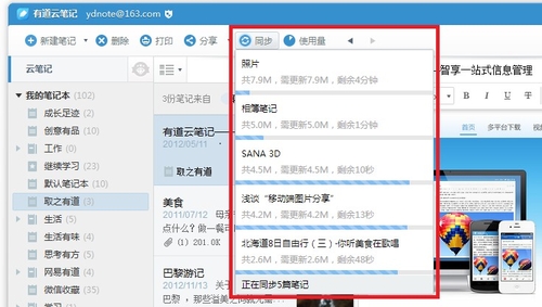 新版有道云筆記對客戶端性能進(jìn)行了全面的技術(shù)優(yōu)化。在新建筆記及不同筆記、筆記本之間的切換,體驗極其流暢。同時,有道云筆記新增多任務(wù)同步。當(dāng)用戶有多篇筆記需要同步時,可同時進(jìn)行最多5篇筆記的數(shù)據(jù)同步。只需把鼠標(biāo)放在“同步”按鈕上,用戶就能清晰看到每一篇筆記的同步進(jìn)度。