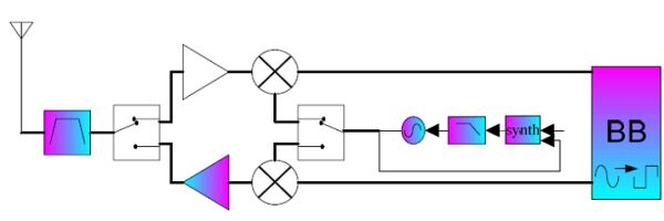圖1給出了TDD無線通信系統(tǒng)框架。圖中的深色模塊表示無線通信系統(tǒng)中最昂貴的模塊。TDD系統(tǒng)將一個(gè)頻帶同時(shí)用于發(fā)射和接收信號,這只需要無線通信系統(tǒng)采用一個(gè)本地振蕩器(LO)。此外,無線通信系統(tǒng)僅要求一個(gè)RF濾波器、發(fā)射器(TX)與接收器(RX)共用該濾波器。合成器與RF濾波器占了無線通信系統(tǒng)的主要成本。可以選擇在裸片內(nèi)減少一個(gè)合成器,LO(特別是作為諧振結(jié)構(gòu)一部分的電感)占射頻裸片的大部分面積。=