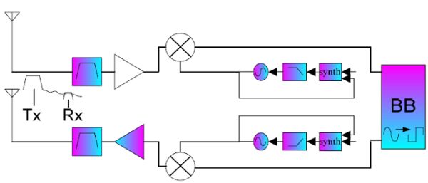 這種無線通信系統(tǒng)必須在不降低接收模式中誤碼率(BER)的情況下傳輸數(shù)據(jù)。為減輕濾波器的負(fù)擔(dān),TX頻帶與RX頻帶之間存在一定的間隙,但載波需要將其降至最小。通常情況下,TX頻帶與RX頻帶的間隙在50MHz到100MHz之間。