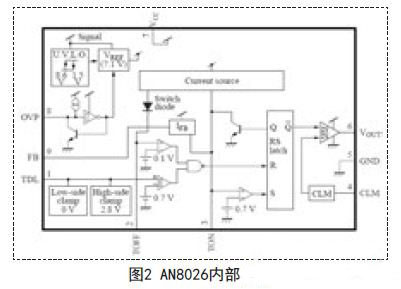 AN8026為松下公司開發(fā)的反激式單端輸出RCC型準諧振軟開關驅(qū)動控制器,封裝為SIP 9腳封裝,各個腳號的定義如表1所示,內(nèi)部框圖如圖2所示,其特點如下: