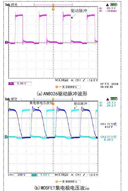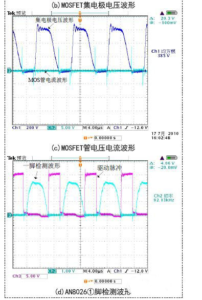 根據(jù)電路原理圖設計,利用軟件AltiumDesigner Summer 09繪制PCB,并調(diào)試樣機,圖4所示為軟開關電源實驗波形。