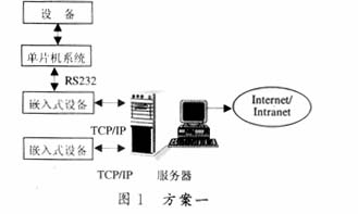 兩種方案都利用了Internet/Intranet網絡資源。不同的是,在方案一中,使用了一臺PC機作為代理服務器接入Internet網絡,這樣便可利用代理服務器提供強大的數據庫功能。該方案適用于測量設備較多,相對集中的場合。嵌入式設備可通過以太網線直接與服務器相連,這樣,嵌入式設備實際上只需要實現一個以太網到RS232的轉換。但是,在某些嵌入式的應用環(huán)境中,并不適合單獨使用一臺PC機作服務器,因此,我們提出方案二,嵌入式設備作為Web Server直接接入Internet/Intranet。嵌入式設備運行一個操作系統(tǒng)并在此基礎之上實現WebServer的功能,這對系統(tǒng)硬件要求比較高,再加上小型嵌入式數據庫技術的不成熟,使得它在數據管理方面稍有欠缺。盡管如此,我們仍采用方案二,因為我們認為它代表著嵌入式系統(tǒng)的發(fā)展方向,其應用范圍更為廣泛,并且,隨著軟硬件水平的不斷提高,上述的缺點都是可以克服的。