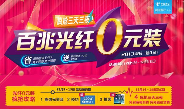 據(jù)活動(dòng)頁(yè)面顯示,2013年底最后一波讓利活動(dòng)將于12月16日至18日火熱來(lái)襲。用戶搶訂光纖寬帶,無(wú)需支付任何費(fèi)用即可安裝,還可獲免光貓租用費(fèi)。除此之外,在12月5日到15日之間進(jìn)行活動(dòng)預(yù)約的用戶還可獲贈(zèng)100元京東券,并有機(jī)會(huì)獲得IPAD。