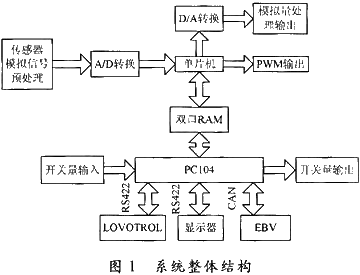 機(jī)車(chē)制動(dòng)控制單元(BrakeControlUnit,BCU)主要分為以下幾個(gè)部分:模擬量輸入、模擬量輸出、數(shù)字量輸入、數(shù)字量輸出、PWM輸出、微處理器部分以及與外圍部分的通信等,系統(tǒng)整體結(jié)構(gòu)圖如圖1所示。