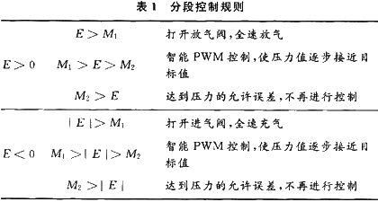 為了實(shí)現(xiàn)對(duì)機(jī)車(chē)制動(dòng)機(jī)氣缸既能精確控制,又能夠快速達(dá)到目標(biāo)值,我們對(duì)氣缸壓力實(shí)行分段控制。單片機(jī)有4路開(kāi)關(guān)量輸出,分別對(duì)應(yīng)制動(dòng)缸的進(jìn)氣閥、放氣閥和均衡風(fēng)缸的進(jìn)氣閥、放氣閥,輸出1代表打開(kāi)閥門(mén),0代表關(guān)閉閥門(mén)。我們以pt表示壓力目標(biāo)值,pi表示當(dāng)前氣缸壓力值,E表示偏差值。所以,有E=pi-pt。M1,M2表示壓力偏差的絕對(duì)值,其中M1>M2,M1表示在接近目標(biāo)值的一個(gè)值,M2表示允許的最大誤差,分段控制規(guī)則如表1所示。