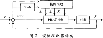 根據(jù)模糊數(shù)學(xué)的理論和方法,將在現(xiàn)場(chǎng)獲得的調(diào)試經(jīng)驗(yàn)和技術(shù)知識(shí)總結(jié)成為IF(條件)、THEN(結(jié)果)形式的模糊推理規(guī)則,并把這些模糊規(guī)則及相關(guān)信息(如初始的PID參數(shù))存入計(jì)算機(jī)。根據(jù)檢測(cè)回路的響應(yīng)情況,計(jì)算出采樣時(shí)刻的偏差E和變化率Ec,運(yùn)用模糊推理,進(jìn)行模糊運(yùn)算,即可得到該時(shí)刻的kP,kI,kD,實(shí)現(xiàn)對(duì)PID參數(shù)的最佳調(diào)整。
