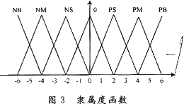Fuzzy-PID就是根據(jù)現(xiàn)場(chǎng)調(diào)試得到在PID參數(shù)預(yù)整定值k′P,k′I,k′D,再利用模糊規(guī)則實(shí)時(shí)在線(xiàn)整定PID控制器的三個(gè)修正參數(shù)△kP,△kI和△kD,實(shí)現(xiàn)對(duì)壓力的優(yōu)化控制。模糊控制器的輸入、輸出變量都是精確量,模糊推理是針對(duì)模糊量進(jìn)行的,因此控制器首先要對(duì)輸入量進(jìn)行模糊化處理。在所設(shè)計(jì)的Fuzzy-PID控制器中,輸入、輸出變量的語(yǔ)言值均分為7個(gè)語(yǔ)言值:{NB,NM,NS,0,PS,PM,PB},他們分別代表負(fù)大、負(fù)中、負(fù)小、零、正小、正中和正大。隸屬度函數(shù)采用靈敏性強(qiáng)的三角函數(shù),如圖3所示。
