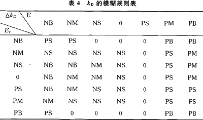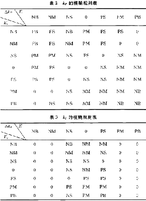 總結(jié)工程設(shè)計(jì)人員的技術(shù)知識(shí)和實(shí)際操作經(jīng)驗(yàn),得到了針對(duì)kP,kI,kD三個(gè)參數(shù)分別整定的模糊控制表,見(jiàn)表2、表3和表4。