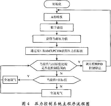 主程序進(jìn)行一系列的初始化后循環(huán)等待中斷;T0產(chǎn)生2ms定時(shí)中斷,T0中斷服務(wù)子程序?qū)χ袛啻螖?shù)計(jì)數(shù),每50次中斷(100ms)為一個(gè)控制周期,每一個(gè)控制周期讀入當(dāng)前氣缸壓力采樣值,調(diào)用模糊PID子程序?qū)飧讐毫M(jìn)行精確控制。