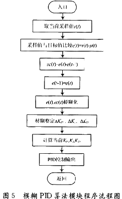 在系統(tǒng)控制電路中,單片機(jī)選用ATMEL公司的AT89C55,程序選用C51進(jìn)行編寫(xiě)。本系統(tǒng)主要模塊有主程序、T0中斷子程序、模糊PID算法子程序等。主程序流程如圖4所示,模糊PID算法的程序流程如圖5所示。