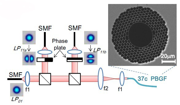 圖2:三種模式(LP01、LP11a、LP11b)的模式復用器和37芯HC-PBGF掃描電子顯微鏡圖像的示意圖。
