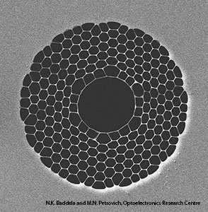 圖1:200nm厚石英玻璃支柱的蜂窩結(jié)構(gòu)形成了這種光子帶隙光纖空心的37根纖芯。