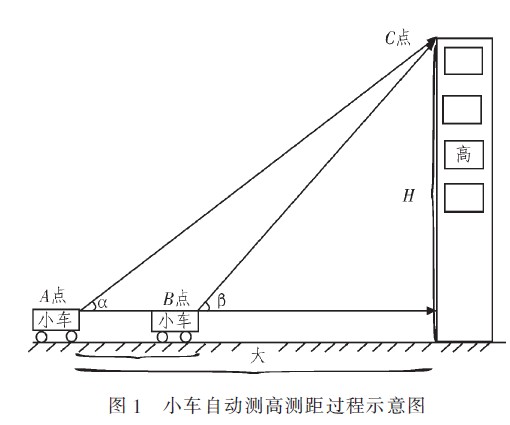 小車自動(dòng)測(cè)高測(cè)距的過程及相關(guān)參數(shù)如圖1所示。當(dāng)小車停放在A點(diǎn)時(shí),遙控小車的裝置調(diào)整角度,使測(cè)量光點(diǎn)定點(diǎn)到C點(diǎn),測(cè)量并存儲(chǔ)此時(shí)的角度α;之后,遙控控制小車前進(jìn),使小車沿直線行進(jìn)到達(dá)B點(diǎn),并再次調(diào)整測(cè)量裝置,使測(cè)量光點(diǎn)再次定點(diǎn)到C點(diǎn),并測(cè)量記錄此時(shí)的角度β。并對(duì)從A到B的行進(jìn)距離L進(jìn)行測(cè)量和記錄。利用以上數(shù)據(jù),就可以計(jì)算出待測(cè)目標(biāo)的高度H及小車距離待測(cè)目標(biāo)的距離S,計(jì)算式如下式(1)所示。