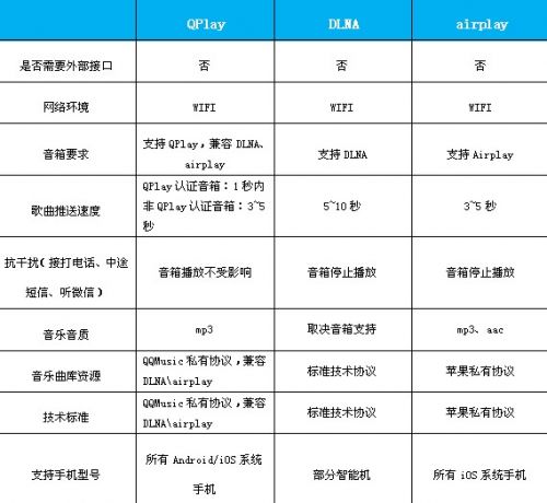 據(jù)了解,目前市面上主流的多媒體連接手機播放音樂內(nèi)容的方式主要有三種——QPlay、DLNA和Airplay,他們各自也都有著各自的特點。下面,我們通過一個表格簡單了解下他們的共同點及區(qū)別,然后再逐項深入介紹。