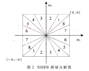 NSDFB由兩通道的非采樣濾波器組迭代構(gòu)成,該濾波器組也沒有進(jìn)行采樣,具有平移不變性。NSDFB可以將第一級(jí)變換所得到的高頻部分分解為2的任意次冪個(gè)方向,每個(gè)方向上的高頻部分與NSP得到的低頻部分以及原始圖像都有相同的大小。NSDFB分解是將信號(hào)在一組基函數(shù)上展開,它對(duì)應(yīng)的基函數(shù)之間是冗余的[4]。頻域分解圖如圖2所示。