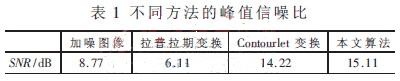 由表1可知,本文算法的SNR明顯提高,圖像視覺也更好,符合真實(shí)情況。Contourlet變換方法能夠抓住圖像幾何本質(zhì)特征,在表現(xiàn)各項(xiàng)異性的奇異性時(shí)性能更加優(yōu)越,因此處理紋理信息豐富的圖像效果更好。