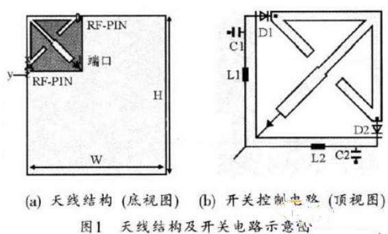 天線可以與手持設(shè)備電路板集成在一起,安裝在電路板的左上角,其結(jié)構(gòu)和RF-PIN開關(guān)控制電路示意圖如圖1所示。