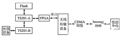 本系統(tǒng)處理數(shù)據(jù)多,計算量大,又有很強的實時性要求,選用ADI公司的高速處理芯片TigerSharc201s。Flash選用JS28F128,容量為256 Mb。系統(tǒng)設計采用兩片ADSP并行的模式。系統(tǒng)結構如圖1所示,TS201A為主DSP,TS201B為從DSP。主DSP經(jīng)Flash采用EPROM加載方式,再通過Link口引導加載從DSP。本處理系統(tǒng)支持多種工作模式,監(jiān)控中心通過內部協(xié)議遠程管控處理系統(tǒng)。從DSP實現(xiàn)信號處理計算,把處理計算結果傳遞給主DSP;主DSP實現(xiàn)管控模塊,通過外圍芯片F(xiàn)PGA的串口協(xié)議發(fā)送給無線傳輸設備,通過CDMA模塊用無線網(wǎng)絡的形式,發(fā)送到監(jiān)控中心軟件。監(jiān)控中心通過協(xié)議對其可實現(xiàn)遠程管理,包括數(shù)據(jù)庫文件更新、程序更新和狀態(tài)模式轉換。