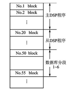 Flash內部分為256個block,可以擦寫任意位置的block段,沒有擦寫的block數(shù)據(jù)不會丟失。根據(jù)這一特性,把兩片DSP軟件程序和分段的數(shù)據(jù)庫的燒寫位置分開。Flash空間地址分配如圖2所示。