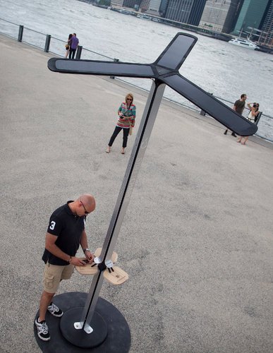 作為一個(gè)試驗(yàn)計(jì)劃,AT&T將首先在紐約市的五個(gè)區(qū),安裝25個(gè)移動(dòng)設(shè)備太陽(yáng)能充電站。每一個(gè)充電站有一根3.8米高的支柱,頂部安裝了三片太陽(yáng)能電池板,依靠太陽(yáng)能進(jìn)行發(fā)電。在底部提供了充電設(shè)備,可以同時(shí)給五個(gè)設(shè)備充電,提供的接口可以支持iPhone、安卓、黑莓和其他USB接口設(shè)備的充電。